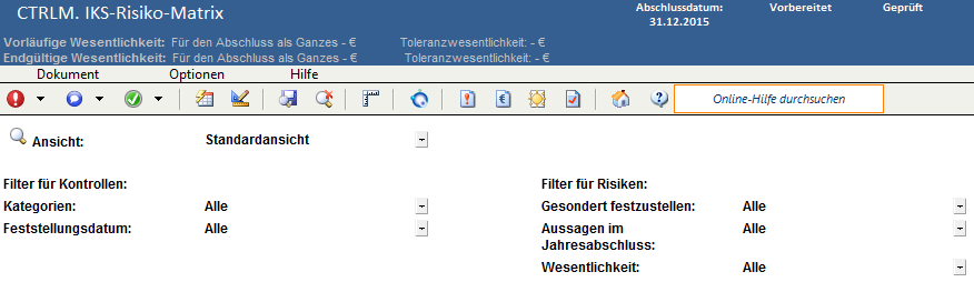 Die Spalten in der IKS-Risiko-Matrix bilden die Felder des Dialogs Kontrolle ab. Weitere Informationen finden Sie in Dialog Kontrolle. Neu! Der IKS-Risiko-Matrix wurde eine Spalte für das Datum der Feststellung hinzugefügt, in der angezeigt wird, wann die Kontrolle erstellt wurde.