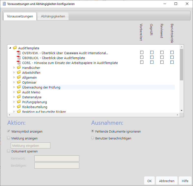 Als Autor der Kanzlei können Sie Voraussetzungen für ein Arbeitsprogramm, eine Checkliste oder ein sonstiges Dokument angeben. Bei Voraussetzungen handelt es sich um andere Dokumente, die vor der Bearbeitung dieses Dokuments ausgefüllt werden müssen.