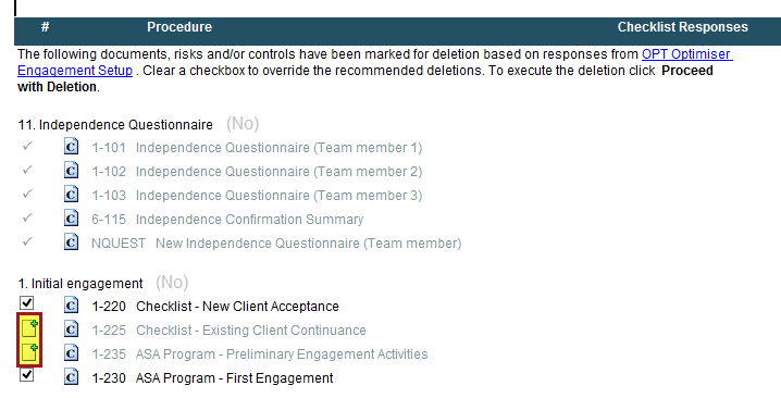 Sie können Ihre Antworten in der Optimiser Checkliste ändern und den Audit Optimiser Bericht (AOCR) erneut erstellen. Abhängig von Ihren neuen Antworten können über den Audit Optimiser Bericht Dokumente und Prüfungshandlungen abgerufen oder gelöscht werden. Für einzelne Prüfungshandlungen erfolgt das Einfügen bzw. Löschen automatisch. Im Falle von Dokumenten werden Sie aufgefordert, diese im Audit Optimiser Bericht einzufügen oder zu löschen.