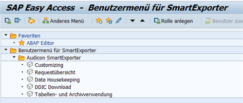 Der SmartExporter SAP®-Komponenten-Administrator kann das Customizing aus dem Ordner Audicon SmartExporter im Benutzermenü aufrufen.