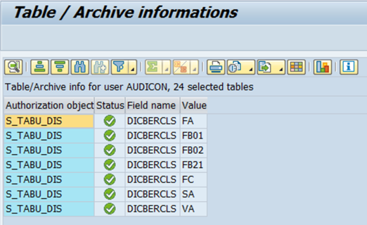 Click the S_TABU_DIS Authorizations or S_TABU_NAM Authorizations button to show a list of the required authorization values for the selected tables.