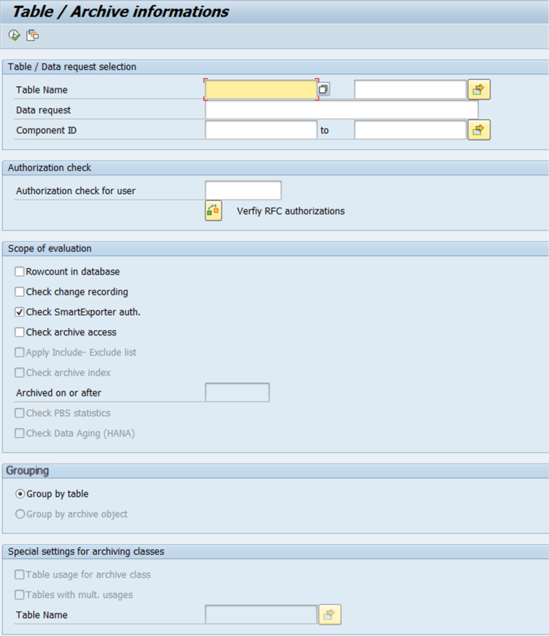 The /AUDIC/SE_INFO transaction allows you to determine various information that is relevant for SmartExporter. For example, you can check if a specific user has the authorizations for tables or a Data Request or you can check if he can access the archive.