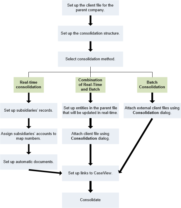 Folgen Sie diesem Flussdiagramm, um Mandantendateien für einen Konsolidierungskonzern einzurichten.