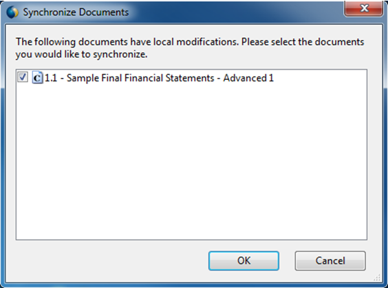Hinweis: Die Liste enthält nur Dokumente, die nach Aufforderung synchronisiert werden sollen und lokale Änderungen enthalten. Dokumente, für die die Synchronisierungseinstellung Nie definiert wurde, sind ausgeschlossen.