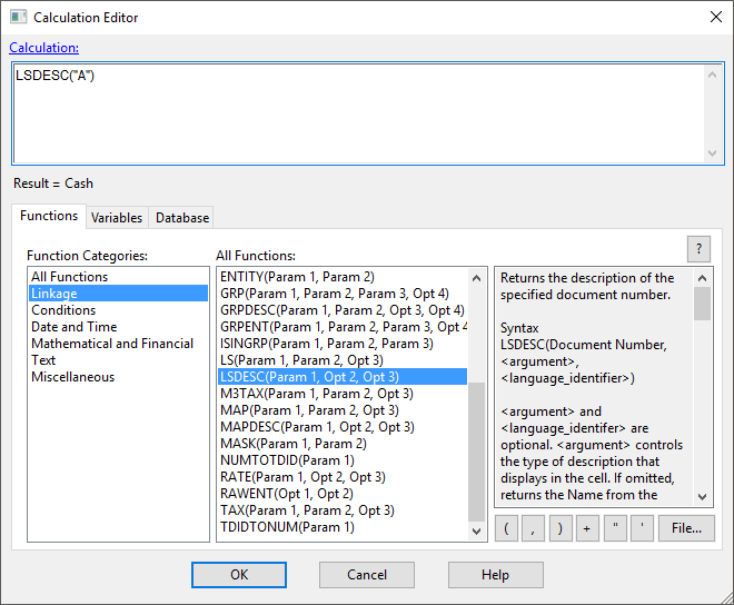 The LSDESC function links the description of a specified document. To link a document description automatically, create a new alphanumeric cell (the description being linked is alphanumeric) and enter the calculation.