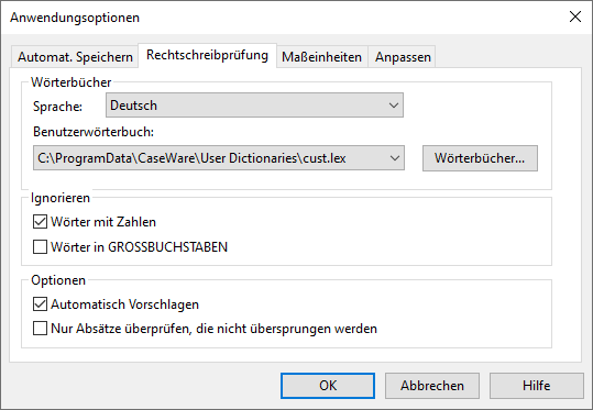 Hier können Sie Optionen für die Rechtschreibprüfung einstellen. CaseView aktiviert standardmäßig die Rechtschreibprüfung.